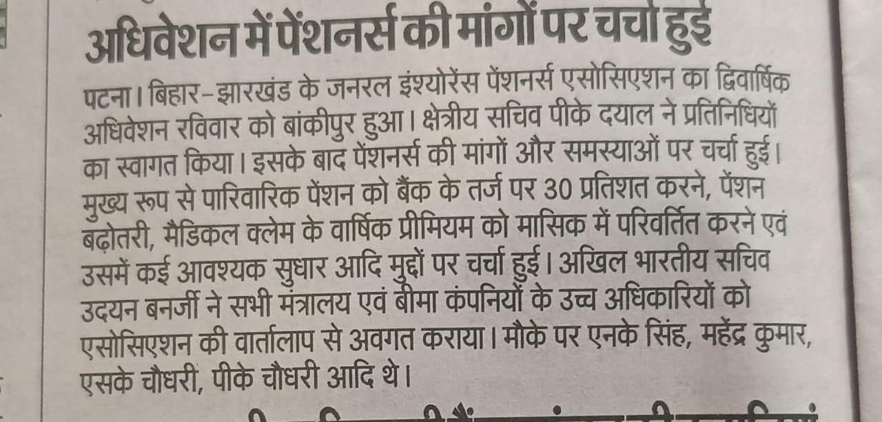 Pensioners’ Key Demands and Issues Discussed at Bihar–Jharkhand General Insurance Pensioners Association Convention.