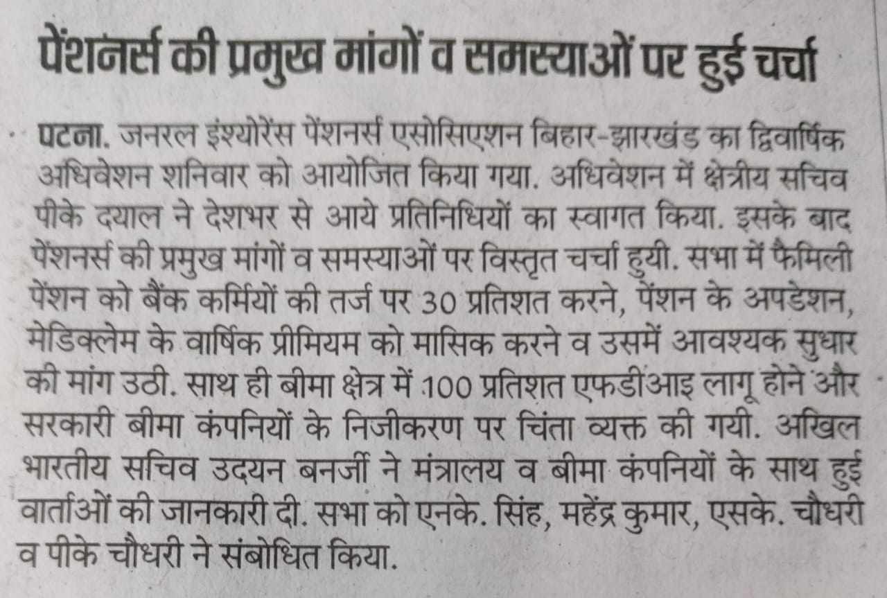 Pensioners’ Key Demands and Issues Discussed at Bihar–Jharkhand General Insurance Pensioners Association Convention.